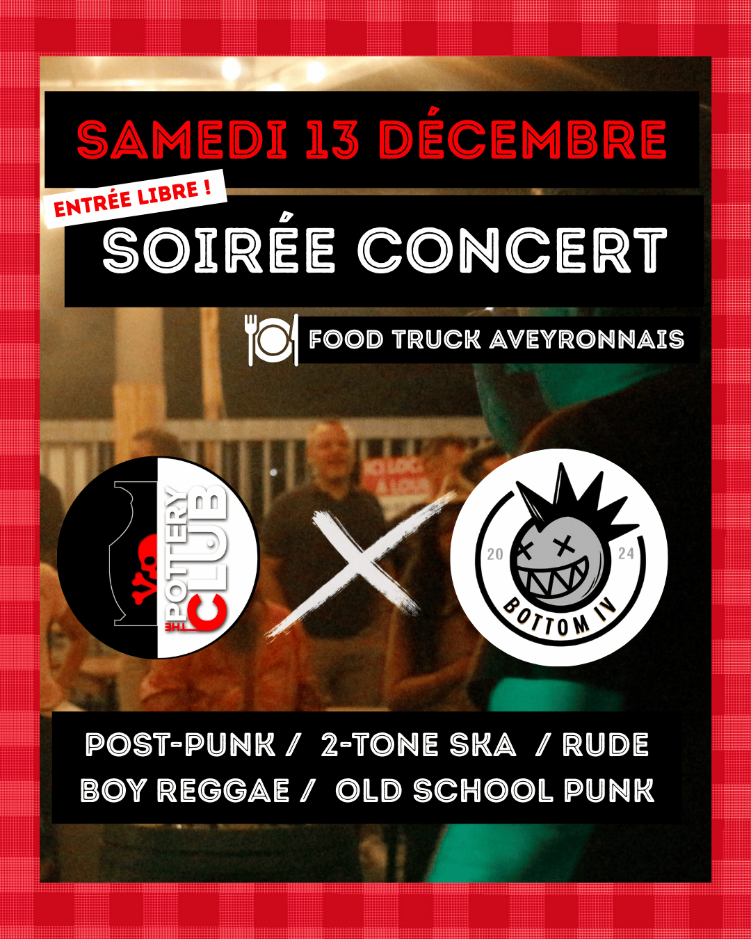 SAMEDI 13 DECEMBRE / DOUBLE CONCERTS / BOTTOM IV // THE POTTERY CLUB / FOOD TRUCK AVEYRONNAIS