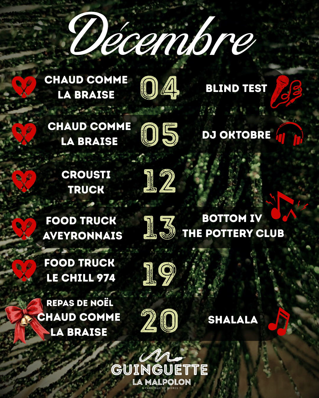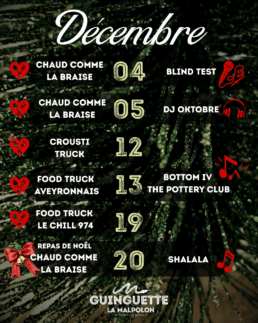 Pour la réservation du repas de noël, vous pouvez vous rapprocher de nous par message, par email à contact@lamalpolon.fr, par téléphone au 09 83 04 59 56 ou bien réserver directement sur place à la guinguette !
