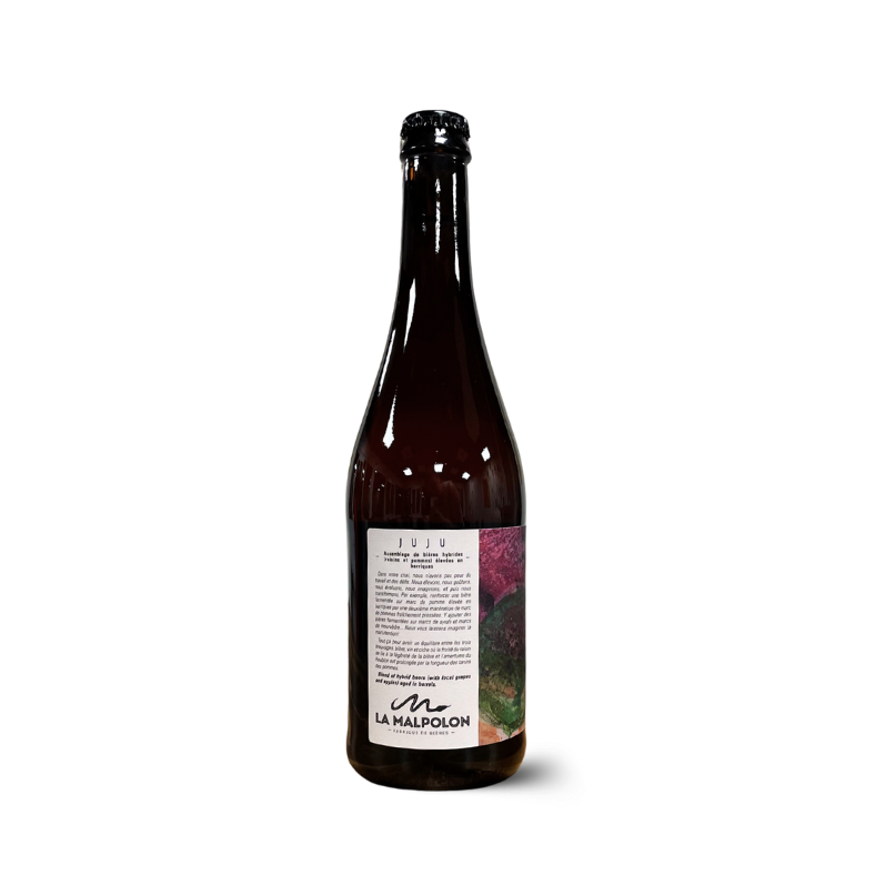 Bière doublement hybride sur une base bière sur marc de pommes et bière aux raisins (Syrah & Mourvèdre).